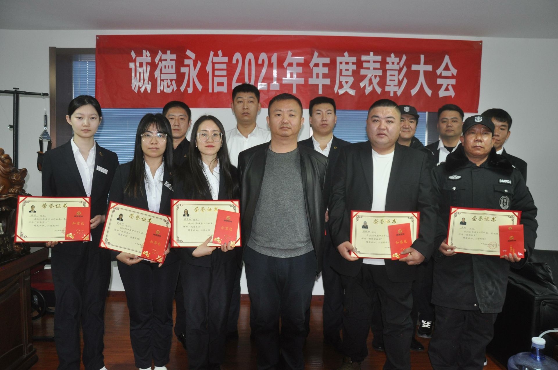 会上董事长王永总结了2021年重点工作,并对2022年工作思路进行了梳理。其次为了弘扬积极工作、无私奉献、奋发向上的优良作风,为企业发展出谋划策、多做贡献的优秀品德,特此给予“优秀员工”、“优秀队员”、“特殊贡献奖”等荣誉称号并颁发了荣誉证书和奖金给予表彰。